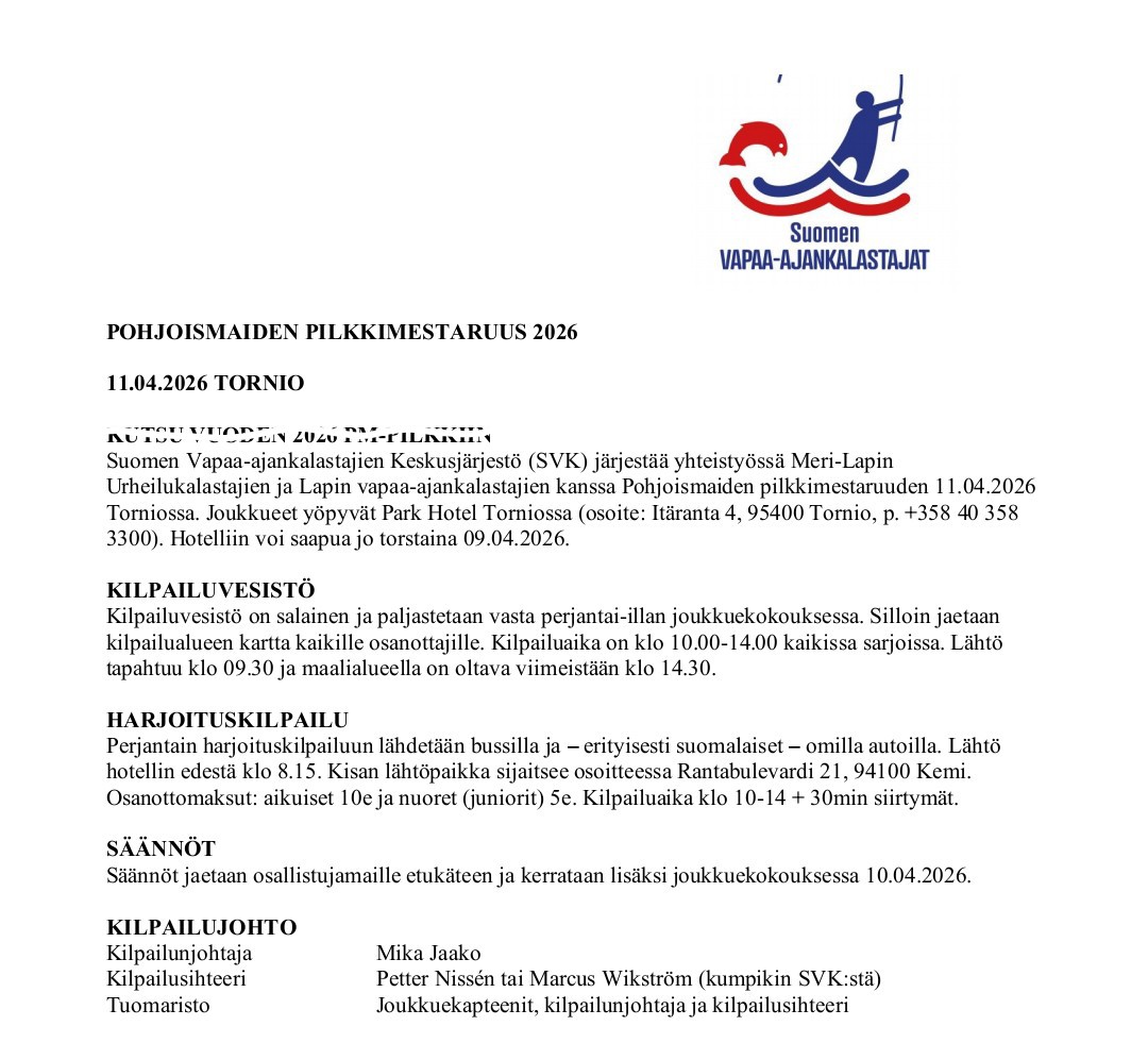 MERI-LAPIN URHEILUKALASTAJAT ovat järjestävänä seurana yhteistyössä Suomen vapaa-ajan kalastajien ja Lapin kalamiespiirin kanssa PM-pilkeissä 11.4.2026 ( Kilpailijat ovat karsinnan kautta valikoituneet)